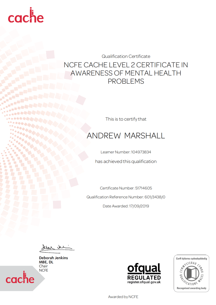 After an almost two year wait, finally been awarded with the NCFE CACHS Level 2 Certificate in Awareness of Mental Health Problems, although I completed and received my certificate for the Level 3 course in September 2020.