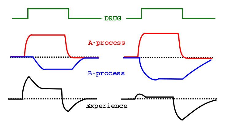 Research on the brain mechanisms of drug addiction showed how the A-process is equated with the pleasure derived from drugs and once it weakens, it is followed by the strengthening of the B-process, which are the withdrawal symptoms.